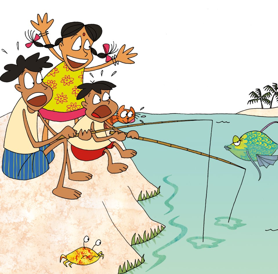 editRồi đến con👶 cá thứ ba, con👶 cá to nhất mà hai bạn từng thấy. Munia cười nói, "Con👶 cá này to hơn cả bàn chân của Appa!"